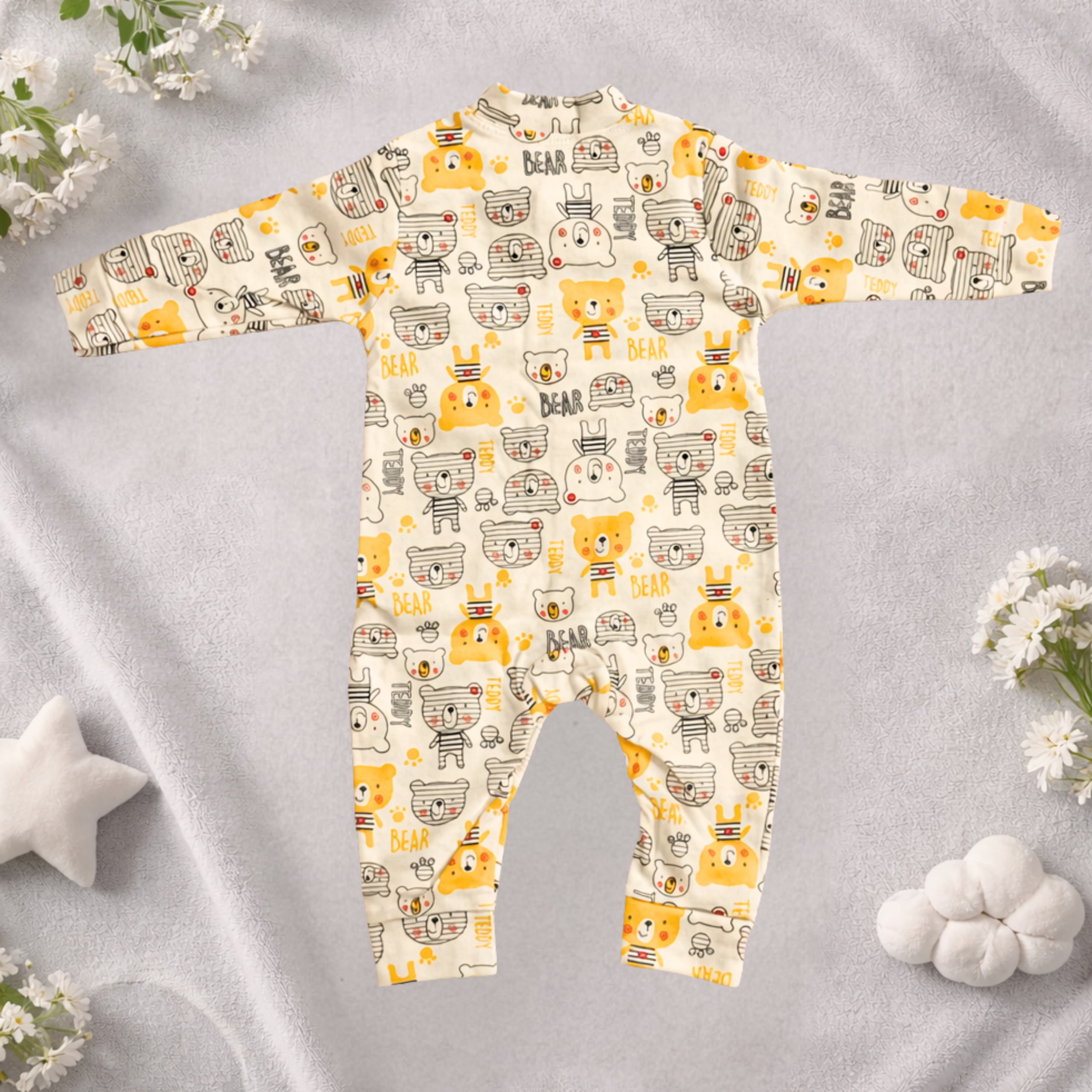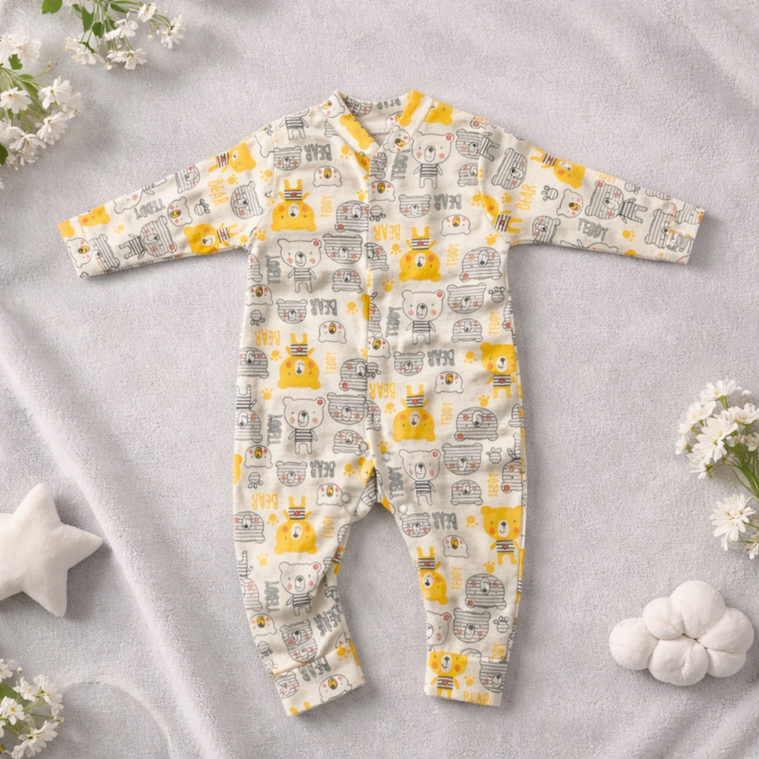 Cute, cozy, and designed for everyday comfort, the Sunny Bear Cotton Bodysuit is made from premium breathable cotton that feels soft and gentle on your baby’s delicate skin. Featuring an adorable grey and yellow bear print, this full-sleeve bodysuit offers a snug yet flexible fit, allowing easy movement throughout the day. With convenient snap-button closures for quick dressing and diaper changes, it’s perfect for playtime, naps, and daily wear—an essential addition to your baby’s wardrobe.